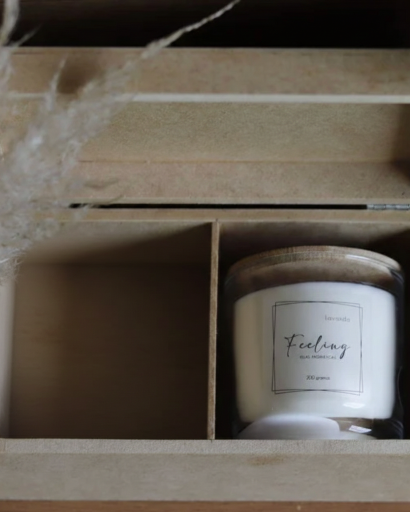 O kit acompanha 1 vela aromática de 200g + 1 caixa em MDF
